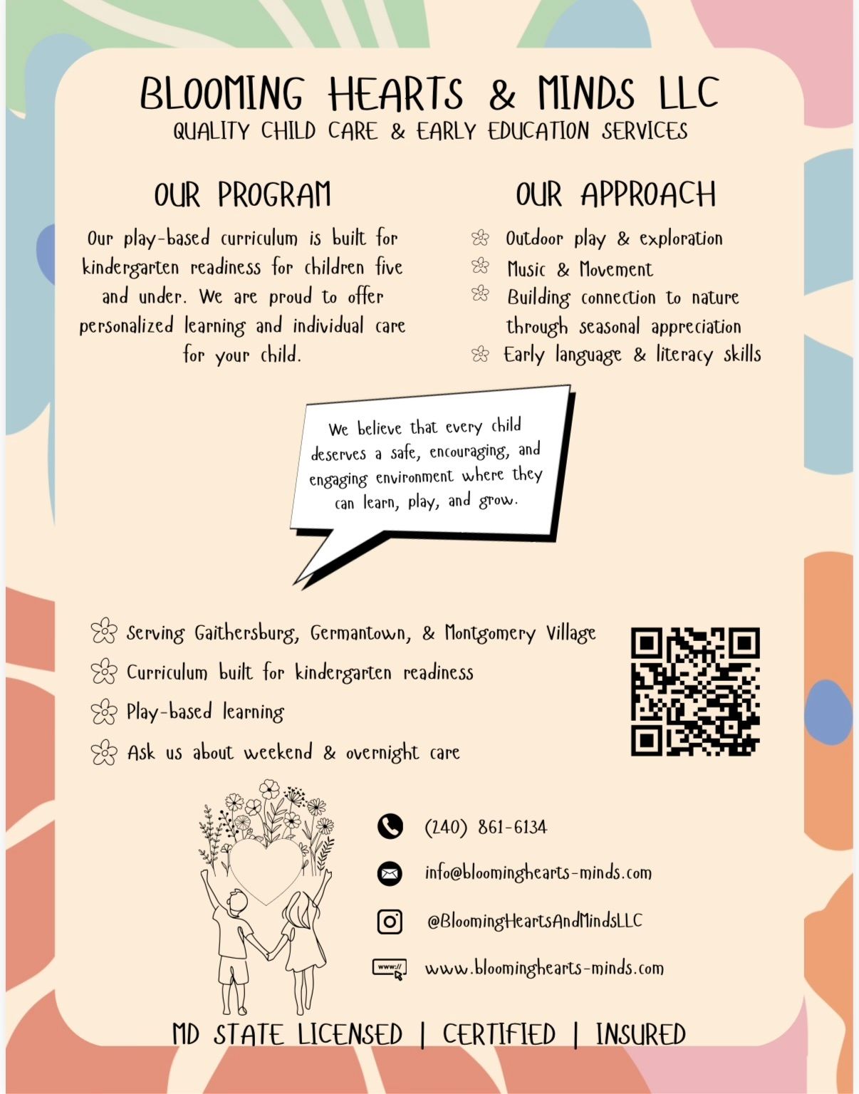 Looking for an early education location in Montgomery County? Check out Blooming Hearts & Minds near Gaithersburg, MD. They have the best teacher and founder who I know personally, she will treat your children as her own!